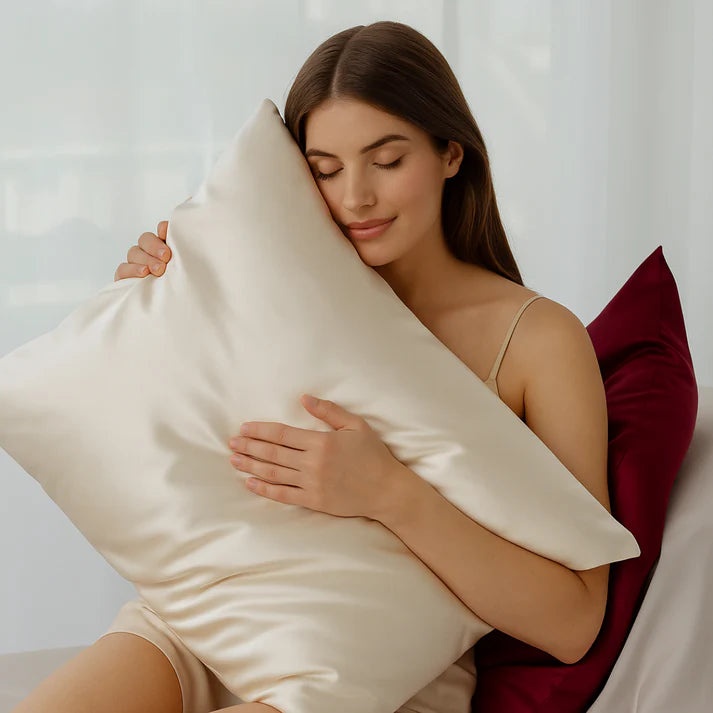Når du sover på vår pute med det myke, pustende silketrekket unngår du søvnrynker og stoffet tørker ikke ut huden din.